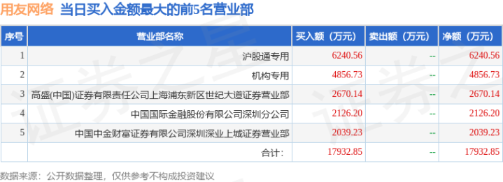 证券之星消息场外配资,沪深交易所2025年8月8日公布的交易公开信息显示,用友网络(600588)因有价格涨跌幅限制的日收盘价格跌幅偏离值达到7%的前五只证券登上龙虎榜。此次是近5个交易日内第1次上榜。