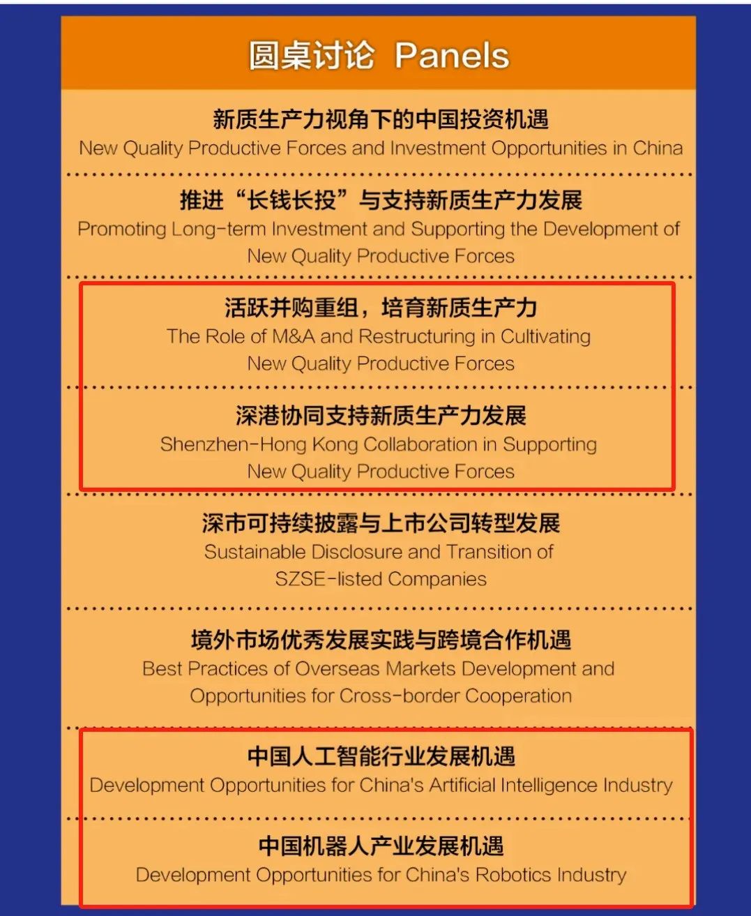 大会还设置了多场圆桌讨论。中信证券国际董事长李春波携手富达国际、安本投资、瑞士百达资产、施罗德投资等机构高管,围绕“新质生产力视角下的中国投资机遇”展开深度对话。此外,围绕“推进‘长钱长投’与支持新质生产力发展”“活跃并购重组,培育新质生产力”等热点话题,深交所将与投资机构、上市公司代表进行深入交流。
