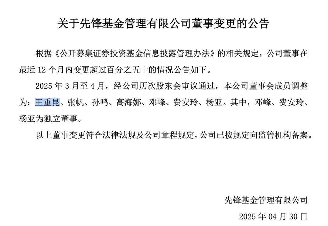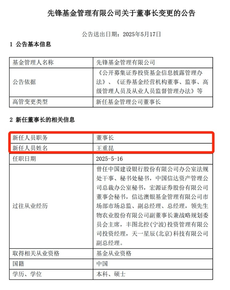 5月17日,先锋基金发布关于董事长变更的公告,任命王重昆担任新一任董事长。