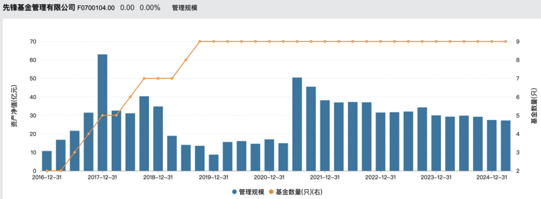 数据显示,截至一季度末,先锋基金管理的非货基金规模为26.91亿元,与去年年末的非货基金规模27.17亿元相比,变化不大。