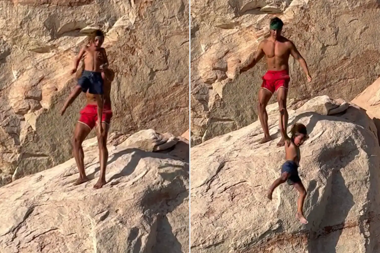 视频中,加雷特和儿子卡利汉站在湖边的一块岩石上。他先是安抚卡利汉的情绪,鼓励他跳下去。随后,又直接抱起卡利汉,抛入水中。