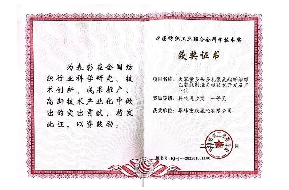 其中,由华峰重庆氨纶有限公司、华峰化学(002064)股份有限公司联合东华大学、西南大学共同研发的“大容量多孔高速氨纶智能制造关键技术开发及产业化”项目,凭借在氨纶生产全链条的突破性创新,荣获中国纺联科技进步奖一等奖,成为引领氨纶行业向绿色化、智能化转型的标杆成果。